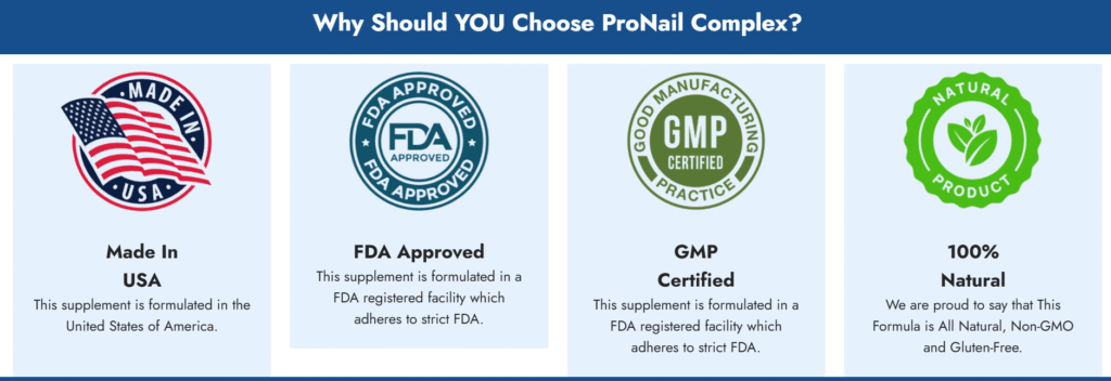 - Manufactured in the USA : Produced in a state-of-the-art, FDA-registered, and GMP-certified facility, ProNail Complex is crafted to meet the highest standards of quality and safety, giving you peace of mind with every use.